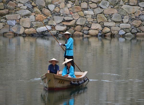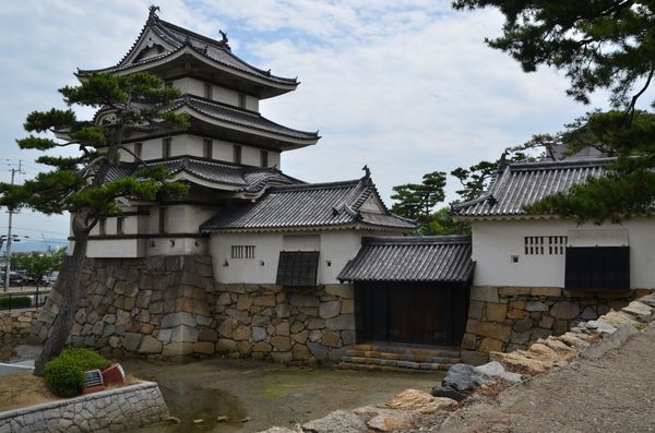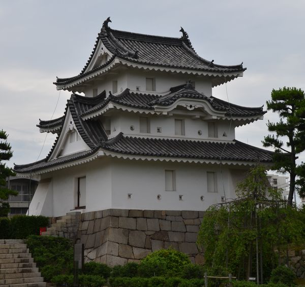 La journée d'aujourd'hui va être consacrée à la visite de Takamatsu, où nous faisons escale pour quelques jours. Située sur la côte de la mer de Seto, Takamatsu compte quelques 500000 âmes. Soraya et moi y sommes arrivés par le train Marine Liner il y a deux jours. La construction du pont de Seto permet désormais un trafic ferroviaire entre Okayama (Honshu) et Takamatsu (Shikoku). La cité s'appelait autrefois Sanuki, du nom de la province du nord-est de l'île de Shikoku dans les temps anciens. A l'époque, il existait un château: Le château de Takamatsu ou « château Tamamo » (de l'ancien nom du site où il fut érigé). Notre balade nous conduit naturellement au parc Tamamo: Le château, ou du moins ce qu'il en reste, s'éleve face à la mer de Seto (on compte seulement trois châteaux côtiers de ce genre au Japon). Ses douves se remplissaient et se vidaient au rythme des marées et des bateaux pénétraient même à l'intérieur du château. Il existait alors trois douves: Les douves extérieures, les douves centrales et les douves intérieures. Les embarcations passaient par la Tour Tsukimiyagura (en photo ci-dessous) qui servait à la fois d'endroit pour observer la lune, et de tour de guet pour surveiller les allées et venues des bateaux. De là, on annonçait également l'arrivée du chef de clan dans les murs. La tour fut achevée en 1676, sous le règne de Yoritsune Matsudaira (2ème génération). Une autre tour, la Tour Ushitora (deuxième photo), fut quant à elle érigée en 1677et possède trois étages. Elle porte le nom de sa position puisque Ushitora voulait autrefois dire « nord-est ». Devenu bien culturel depuis 1950, le bâtiment sera transféré à la ville en août 1965 et bénéficiera d'une rénovation couteuse (plus de 28 millions de yens) qui durera deux années.