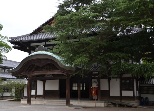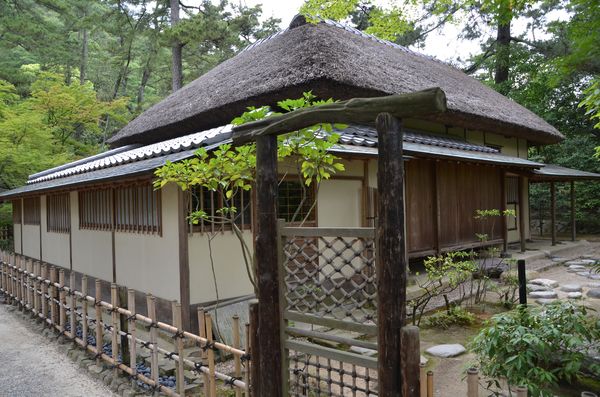 Il faut compter deux heures pour apprécier l'ensemble du site mais il existe également des parcours de soixante minutes (balisés comme tels). Il faudra compter un peu plus de temps si l'envie vous prend de faire une halte dans l'une des maisons de thé qui se trouvent dans le parc de Ritsurin, comme par exemple celle de Higurashi-tei (en photo ci-dessous), loge à thé de style Soan, qui fut construite en 1898 avec un superbe toit de chaume. Ou bien la loge à thé  Kikugetsu-tei qui fut jadis le lieu préféré des seigneurs locaux et qui est équipée de multiples pièces donnant sur le bassin sud. A l'intérieur du parc se trouvent aussi le nouveau Fuji (appelé aussi Fuyoho Shinfuji, troisième photo ci-dessous) et le vieux Fuji (surnommé Hiraino ou Kofuji, quatrième photo).Ces points élevés permettent aux promeneurs de profiter successivement d'une vue imprenable sur le Mont Shiun au loin et le pont Bairin-Kyo, puis sur le bassin sud et le pont Engetsu-Kyo. Soraya et moi terminerons notre promenade en passant devant le Hall pour la promotion du commerce et de l'industrie (cinquième photo): Bâti en 1899, il y a plus de cent ans, l'endroit servit d'abord de musée préfectoral de Kagawa pour devenir de nos jours le présent hall d'exposition pour de nombreux produits de Kagawa, à commencer par les produits laqués traditionnels qui sont présentés puis mis en vente (avec des démonstrations offertes les samedis, dimanches et jours fériés).