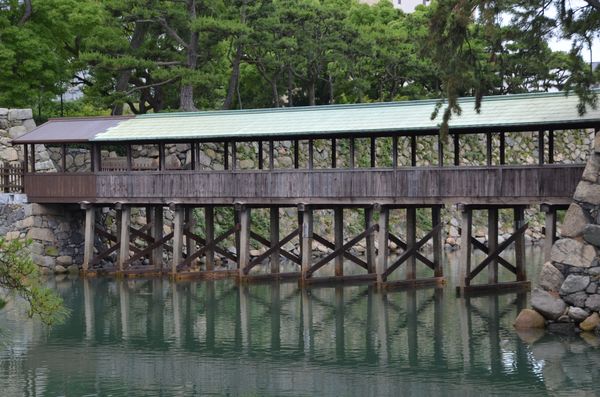 Le château de Takamatsu fut pour la première fois construit sur ordre de Hideyoshi Toyotomi, en 1588, par un de ses vassaux, le lord Chikamasa Ikoma, qui y séjournera, lui, et ses descendants, durant 54 ans (soit quatre générations). En 1642, Yorishige Matsudaira vint s'y installer et sa famille restera sur place pendant les 228 années suivantes, c'est à dire jusqu'au début de la période Meiji. Durant  tout ce temps, le château sera le centre névralgique de la ville pour les décisions politiques, économiques et culturelles de celle qu'on appelait alors Sanuki. Yorishige décrètera ausitôt la natation comme sport du Bushido pour la chevalerie japonaise et ordonnera dès l'été 1643 à l'un de ses vassaux d'enseigner cette discipline à ses hommes. Le bassin de natation des Matsudaira existe toujours aujourd'hui (ci-dessous) et des promenades en bateau y sont même organisées pour les touristes. Yorishige y nagea en juin 1642. De cet endroit, on aperçoit au loin le pont Sayabashi (deuxième photo), seul pont reliant Honmaru (le cœur du château) à Ninomaru. Autrefois équipé de parapets, l'ouvrage fut coiffé d'un toit à la fin de la période Edo.