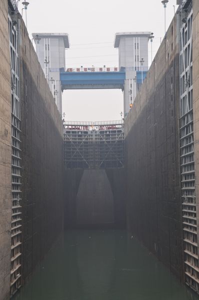 Notre bateau remonte allègrement le Yang-Tsé-Kiang et arrive bientôt au barrage de Gezhouba : situé dans la banlieue ouest de Yichang, le barrage en question mesure 2595 mètres de long et 47 mètres de haut. Il fut bâti de 1970 à...1988. Et comporte deux centrales hydroélectriques d'une capacité de 2715 MW, générant chaque année une production de 14100 Gwh. Son volume total est de 1580 millions de mètres cubes. A l'approche du barrage, c'est l'effervescence sur le pont et tout le monde s'affaire afin de prendre des photos de l'écluse que nous nous apprêtons à franchir (ci-dessous). C'est la China Yangtze Power qui possède le barrage. Cette entreprise de production hydroélectrique exploite ses propres usines sur le fleuve et gère le barrage de Gezhouba et celui des Trois-Gorges (en partie seulement). Notre embarcation pénètre lentement dans cette grande écluse. Un petit quart d'heure suffira pour que celle-ci se remplisse (par le fond) et atteigne le niveau supérieur du fleuve. Un monde nouveau s'offre à nous : la Gorge Xi Ling.