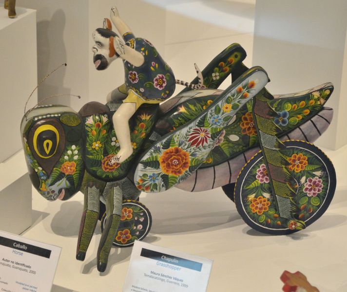 Les jouets mexicains font également partie intégrante de l'art populaire, à cause de leur caractère innocent, de leurs formes basiques, de leurs couleurs vives, de leur conception simple et de leurs mécanismes. Certains sont des joyaux de l'artisanat national et le fruit de l'imagination et du talent de ceux qui les ont conçus. Ces jouets doivent éveiller l'enfant qui les utilise, en lui enseignant les traditions culturelles et en lui apprenant à maitriser son environnement. Heureusement, de nombreux jouets populaires sont toujours plébiscités par le jeune public en dépit de l'arrivée sur le marché de jouets électroniques. Certains d'entre eux sont fabriqués à certaines époques de l'année, en fonction des fêtes et des rites religieux, comme les matracas, hochets en bois, ou encore les sonatas, bâtons musicaux, ou les silbatos, sifflets utilisés à Noël. D'autres, comme les toupies, les bilboquets, les yoyos, les cerf-volants ou les petits chariots sont produits tout au long de l'année car plus régulièrement utilisés par les enfants. Cette sauterelle (ci-dessous), magnifiquement décorée, illustre parfaitement le talent artisanal mexicain. Ce jouet fut fabriqué en 1990 par Maura Sanchez Vaquez à Temalacatzingo Guerrero (Etat de Mexico).