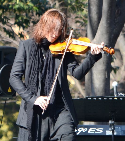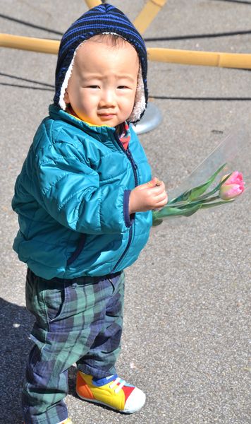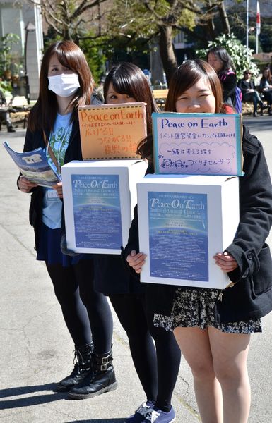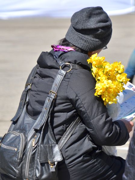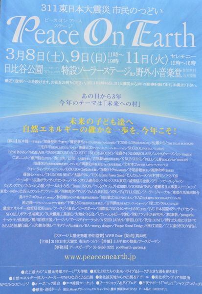 Pour l'heure, je me suis rendu ce mardi au parc Hibiya où un rassemblement était organisé afin de se souvenir du triste séisme de mars 2011. J'arrive sur place un peu avant midi et observe la mise en place de la manifestation qui rassemblera près de deux cents personnes deux heures plus tard. A mon arrivée quelques dizaines de promeneurs sont déjà là, s'dressant pour certains d'entre eux au point d'information de cette journée intitulée « Paix sur Terre » (en photo ci-dessus). La Nature nous a pour l'occasion gratifié d'une superbe journée : un soleil radieux brille sur fond de ciel azur. Il fait froid mais l'air sent déjà le printemps. D'ailleurs, les premières fleurs de cerisiers sont déjà apparues dans le parc (ci-dessous). Non loin de là, le drapeau national est en berne, sur le fronton des bâtiments. Je décide de déjeuner à proximité du parc, et choisis de m'arrêter au café « A la Tienne », un établissement au parfum français, mais bel et bien japonais à l'intérieur. De retour au parc, je découvre des artistes sur scène, qui célèbrent à leur façon la triste journée. Autour de moi, j'aperçois des Japonais, jeunes ou vieux, des fleurs à la main (ci-dessous).