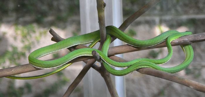 Non loin de là se trouve un serpentarium : j'y photographie le boa constrictor, le boa de mangrove, ainsi que le serpent de vigne vert. J'y reconnais quelques vipères venimeuses, dont la vipère au nez retroussé et le fameux fer de lance. Ce dernier est le serpent qui cause le plus de pertes humaines parmi les serpents américains car ses crochets injectent des quantités très importantes d'un venin extrêmement toxique. Il habite les forêts tropicales du Costa Rica et reste un serpent terrestre. C'est aussi un très bon nageur et il peut, si nécessaire, escalader les arbres pour atteindre ses proies. Le serpent de vigne vert (ou serpent de fouet, en photo ci-dessous) est originaire d'Amérique du sud, d'Asie et d'Inde. Il peut atteindre deux mètres de long et tue ses proies en leur injectant des toxines avec leurs crocs arrière. Il n'est cependant pas nocif pour l'homme. On en trouve beaucoup en Amérique centrale. C'est un serpent arboricole qui vit généralement dans les arbres ou dans les branches en surplomb situées près des rivières et des ruisseaux. Il adore les zones de végétation dense et humide. Sa couleur peut varier du vert clair au brun rouille et il se nourrit de grenouilles, de petits rongeurs et de lézards.