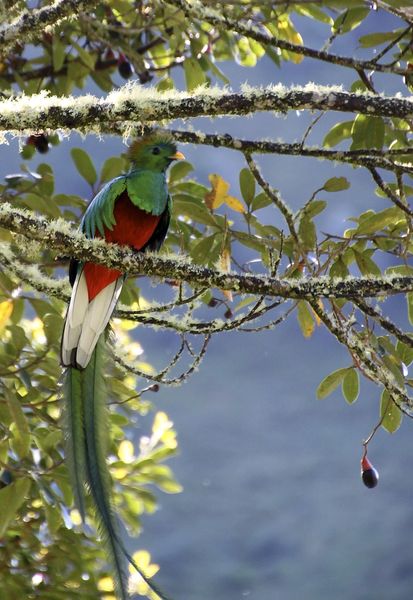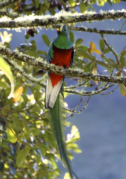 Le quetzal qui nous intéresse aujourd'hui est le quetzal resplendissant (ci-dessus). C'est un oiseau mythique de la forêt tropicale du Costa Rica, mais aussi l'oiseau national du Guatemala, tout proche. On le retrouve d'ailleurs sur les armoiries de ce pays. Mais l'oiseau est malin et presque insaisissable, car il cache son plumage d'émeraude et de rubis dans l'épaisseur végétale de la forêt. J'aurai ainsi le plus grand mal à l'observer et serai malheureusement dans l'impossibilité de prendre de bonnes photos de cet animal (les photos de cet article ne sont pas les miennes mais m'ont été fournies par Greivin). Répandu dans les forêts humides des montagnes du Mexique et de l'Amérique centrale, jusqu'au Costa Rica, le quetzal resplendissant séjourne habituellement à une altitude de 2000 à 2700 mètres d'altitude. Ici, au Trogon Lodge, nous sommes à 2300 mètres.