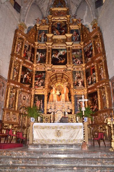 Non loin de là, l'église Santa Ana (ci-dessous) s'élève avec sa tour. Sa construction remonte à 1276, sur ordre du roi Alphonse X. D'après une inscription sur l'un de ses murs, ce roi voulut ainsi glorifier Sainte Anne, à qui il devait la guérison miraculeuse d'une maladie oculaire dont il souffrait. Après la conquête de Séville, le roi Alphonse X avait développé une ville nouvelle au sud du Château du quartier de Triana. Etant la première église à avoir été érigée après le départ des Musulmans, on avait à l'origine prévu de fortifier l'édifice religieux. Quant à la tour, elle fut rajoutée après la fin de la construction de l'église. Le bâtiment sera fortement endommagé par le séisme de 1355 et nécessitera d'importants travaux de rénovation. Parmi les curiosités du lieu, il ne faut pas manquer de descendre dans la crypte de l'église, qui présente habits sacerdotaux et objets religieux de valeur. On admirera également la Grande Chapelle (deuxième photo), qui contient le retable majeur, œuvre en bois doré attribuée à Nufro Ortega et Nicolas Jurate. Celui-ci possède trois corps. On y retrouve plusieurs tableaux de Pedro de Campana datant de 1557. En son centre, se trouve une niche contenant une représentation de Sainte Anne (à droite) avec sa fille Marie et l'Enfant Jésus, datant de la seconde moitié du XIII è siècle.