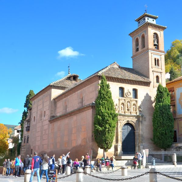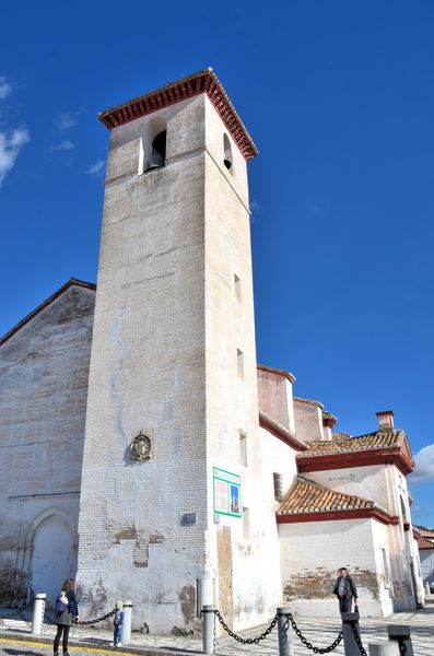 Le Mirador Saint Nicolas ne se trouve qu'à cinq minutes de là. L'endroit est fort fréquenté en ce samedi midi. Le soleil aidant, les touristes lézardent en admirant l'Alhambra , juste en face. Un habitant, qui a vu mon drapeau breton sur mon sac à dos m'interpelle : « Vous êtes breton ? ». Je lui réponds que oui, et lui précise que je suis natif de Saint Malo. Et lui, de me citer la phrase : Malouin avant d'être breton, et breton avant d'être Français. J'ai manifestement affaire à un connaisseur. Ce monsieur est également breton et vit dans des grottes situées dans le Barronco (quartier) de San Miguel, au pied de la muraille de l'Albaicin. Il m'explique que ces grottes-là ne ressemblent en rien aux maisons troglodytes que j'ai observées plus bas. Qu'elles sont occupées par des artistes qui viennent ensuite vendre leurs objets en ville. A une dizaine de mètres de là, s'élève l'église Saint Nicolas (ci-dessous), qui fut construite en 1525 dans le style mudéjar. Il est temps pour moi de rebrousser chemin, et de redescendre en direction du quartier de la cathédrale de Grenade.
