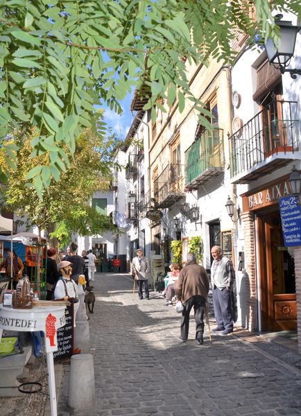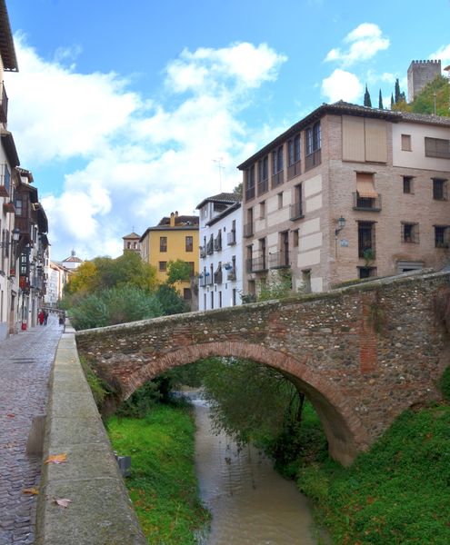 J'emprunte maintenant la Carrera del Darro (ci-dessous). Cette rue pittoresque rappelle une certaine ambiance médiévale avec ses vieilles maisons et ses vieux ponts enjambant la rivière, le Darro (surnommée la rivière d'or, en souvenir de chercheurs d'or qui travaillaient autrefois dans ce cours d'eau). C'est le long de cette rue que se trouve le Banuelo (bains musulmans), des bains maures datant du XI ème siècle et qui possèdent des voûtes en briques. Les colonnes incorporent des chapiteaux dont les origines sont romaines, wisigothiques et arabes.