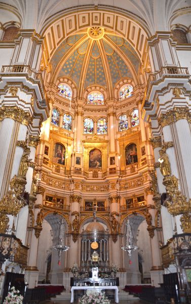 Celle qu'on appelle la Cathédrale de l'Incarnation est un édifice de la renaissance, qui fut bâti à partir du XVI ème siècle. C'est la première église à avoir été érigée dans ce style dans la péninsule ibérique. Elle fut souhaitée par les rois catholiques et sa construction débutera sous le règne de Charles Ier, pour s'achever en 1704, sous celui de Philippe V. Suite à la reconquête de Grenade en 1492, les rois catholiques décidèrent de la construction d'une cathédrale bâtie sur le site d'une ancienne grande mosquée nasride. C'est à Juan Gil de Hontanon et à Enrique Egas que sera confié ce projet. Mais ce seront finalement les plans de l'architecte Diego de Siloé (lequel travaille déjà à l'époque sur le monastère de San Jeronimo de Grenade) qui seront retenus. La cathédrale (en photo ci-dessous) domine le quartier environnant de sa masse imposante. Sa façade principale est de style baroque et est l'oeuvre d'Alonso Cano (1667). L'intérieur est très vaste, et son plan est clairement inspiré de l'architecture gothique. Avec ses cinq nefs et son transept non saillant, il rappelle celui de la Cathédrale de Bourges (France). La chapelle majeure du choeur (deuxième photo ci-dessous) est surmontée d'un superbe coupole de 45 mètres de haut, qui est appuyée sur des piliers corinthiens. A ne pas manquer non plus : la sacristie et le petit musée (situé près de l'entrée), où il est interdit de prendre des photographies.