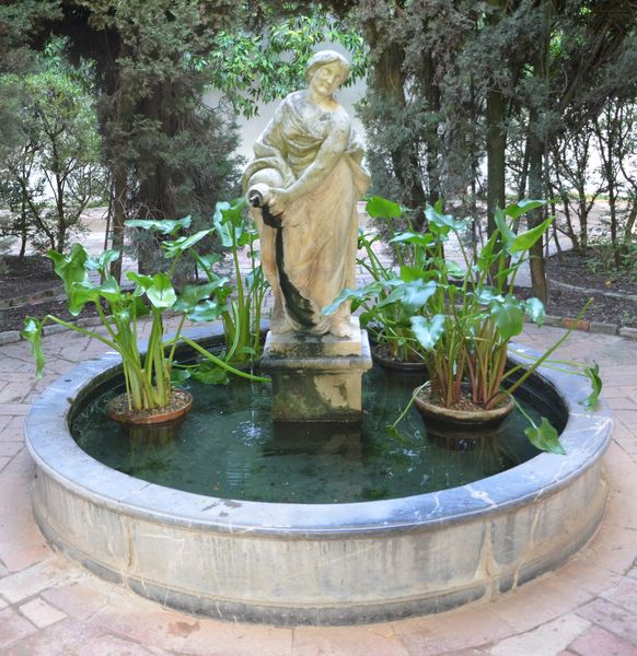 A présent, visitons le Patio de Madame (ci-dessous). Celui-ci fut réalisé lors des travaux de rénovation au XVIII ème. Il s'agit d'un patio de style classique et intime, conçu pour être vu de l'extérieur. Il doit son nom à la statue de cette dame de la fontaine qui préside les lieux. L'ensemble des cyprès taillés qui entoure la fontaine a été ajouté au début du XX ème siècle. On peut aussi trouver quelques colonnes et des restes archéologiques qui viennent embellir la cour. Sur place, les plantes principales sont le cyprès éternellement vert, le jasmin blanc, qui embaume et recouvre les murs, et le séneçon maritime.