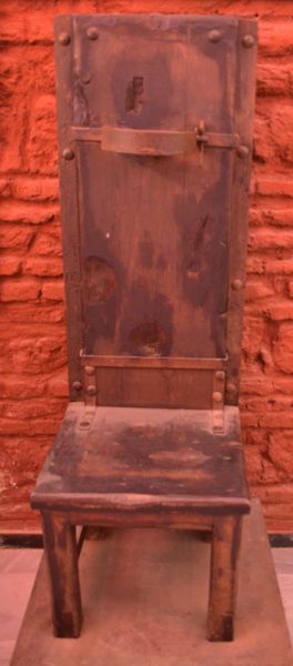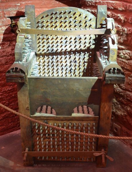 La chaise d'interrogatoire (ci-dessus) était équipée de pointes métalliques. Un mécanisme immobilisait la victime au niveau du thorax, des poignets et des jambes. Certaines chaises étaient aussi recouvertes de plaques de fer qu'on faisait chauffer en introduisant du charbon brûlant sous l'assise du siège. Ces chaises furent utilisées en Europe entre 1700 et 1800.