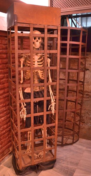 L'usage des cages (ci-dessus) étaient en vigueur durant l’Inquisition espagnole. Après la torture, on y introduisait la victime nue ou pratiquement nue. Puis on suspendait la cage (de bois ou de fer, selon les cas) sur les façades des bâtiments municipaux, des Palais de Justice, des cathédrales ou sur les poteaux de croisement des chemins. Il n'était pas rare d'observer toute une rangée de cages alignée au même endroit. Les prisonniers restaient ainsi confrontés aux brûlures du soleil en été, ou au froid en hiver, mais aussi à la faim et à la soif. Lorsqu'ils mouraient, on laissait leurs dépouilles dans les cages jusqu'au détachement des os, pour servir de pâture aux oiseaux, et d'exemple à la population. Ces cages seront d'abord utilisées à Venise puis dans les villes d'Europe, jusqu'à la fin du XVIII ème.