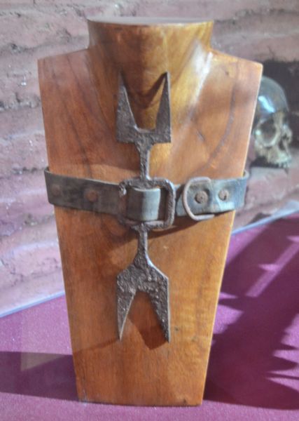 La fourche de l'hérétique (ci-dessus) était quant à elle mise à contribution pour obtenir des confessions : composée de quatre pointes aiguës qui s'enfonçaient dans la chair, cette fourche se plaçait en-dessous du menton et au-dessus du sternum. Elle empêchait les mouvements de la tête, laissant tout juste le torturé murmurer ses confessions. S'il refusait d'avouer, il était brûlé sur le bûcher.