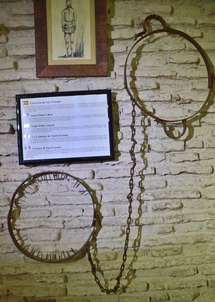 La ceinture de Saint Erasme (ci-dessous) était passée autour du corps du prisonnier et provoquait des blessures à chaque mouvement de respiration. Les blessures provoquaient à leur tour infection, putréfaction ou gangrène. Il arrivait que le bourreau ajoute des vers carnassiers sur les plaies ouvertes afin d'accélérer le rongement de l'estomac. Cette torture était utilisée en Europe de 1500 à 1800.