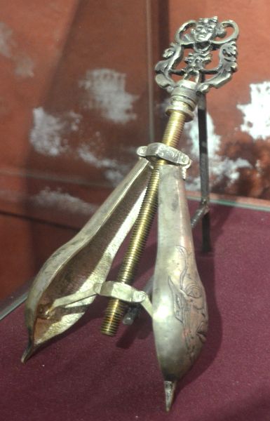 Le brise-genoux (ci-dessous) était destiné à détruire les articulations (genoux, coudes, poignets ou chevilles) en provoquant de terribles douleurs et dans tous les cas, des dégâts irréversibles. Il fut utilisé en Europe de 1600 à 1800.