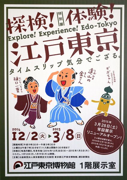 Exposition « Explore!Experience ! Edo-Tokyo », jusqu'au 8 mars 2015, au Musée Tokyo Metropolitan Edo-Tokyo, 1-4-1 Yokoami, à Tokyo. Tel : (+81) 3 3626 9974. Entrée : 300 yens. Ouvert tous les jours (sauf le lundi) de 9h30 à 17h30. Prise de photos autorisée. Pour vous y rendre: emprunter la JR Sobu Line, descendre à la station Ryogoku, emprunter la sortie ouest puis marcher trois minutes. Site internet : http://www.edo-tokyo-museum.or.jp/english/