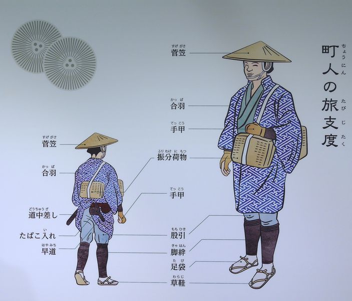 A l'époque d'Edo, mieux fallait être bien équipé pour se lancer sur la route sinueuse du Tokaïdo : on conseillait au voyageur de se munir de trois serviettes, d'un grand foulard de tête, d'un éventail pliant, d'un calmar (pinceau et pot à encre dans un petit étui passé à la ceinture), de papier de soie pour se moucher, d'un grand porte-monnaie (porté de préférence en bande ventrière), d'un petit porte-monnaie, d'un cure-oreille, d'un petit poinçon, d'un pyxide contenant une petite pierre à encre, d'un petit abaque, d'un petit peson (on pesait les pièces d'argent dans la région de Kyoto), de deux grands carrés de tissus (furoshiki, servant par exemple à empaqueter un baluchon), d'une pharmacie de campagne, de fil et d'aiguille, de matériel de coiffure, d'une lanterne de papier huilé, d'une boite à déjeuner, de trois cordes,....Ce même voyageur était par ailleurs mis en garde vis à vis de ces joyeux lurons qui vous proposent de cheminer ensemble. On déconseillait aussi de prendre des médicaments venant de personnes inconnues. Comme sur la photo ci-dessous, la tenue préconisée était composée d'un foulard de tête ou d'un chapeau de laîche tressée (large chapeau plat), avec les pans du kimono retroussés et fourrés sous la ceinture, des tire-cuisses (genres de caleçons longs), des bandes molletières, des tabis (chaussettes de tissu avec le gros orteil indépendant pour passer l'oeilleton de l'espadrille), une applique de tissu épais pour protéger le dos de la main et éventuellement du pied, et une pèlerine. Quant aux bagages à main, ils étaient composés d'une petite malle d'osier tressé et d'un baluchon porté en palanche ou en sautoir sur l'épaule lorsqu'il était léger. Par ailleurs, chaque voyageur était autorisé à porter à la ceinture un sabre court servant à dissuader l'agresseur éventuel. Mais seuls les yakuza en faisaient usage. Ces yakuza étaient les ancêtres des gangsters d’aujourd’hui. Par un accord tacite avec le pouvoir, ils faisaient régner l'ordre sur les routes en échange de quoi l'autorité leur laissait la haute main sur les jeux et la prostitution. Echange de bons procédés. Les femmes étaient quant à elles incitées à porter un surtout par-dessus le kimono afin de ne pas salir ce dernier, lequel, sous l'ère Edo, consistait en un simple yucata (peignoir de coton). Elles pouvaient enfin se munir de bandes molletières, de sandales attachées, de cache-mains, de tabi blancs, d'un chapeau de laîche et d'un bâton à la main.