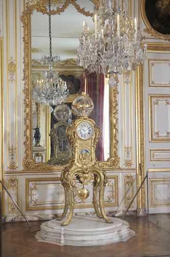Nous voici à présent dans la seconde antichambre, plus vaste que la première, lieu aussi appelé Cabinet de la pendule, qui servait à recevoir la société du roi, c'est à dire ses amis. Ceux-ci partaient ensuite souper avec Sa Majesté ou pour une partie de chasse. Plusieurs objets se trouvent dans cette pièce, à commencer par une superbe horloge astronomique, véritable prouesse technologique pour l'époque, une invention que l'on doit à Passemant, ingénieur du roi, mais aussi à l'horloger Dauthiau. Cette œuvre en bronze doré exigea vingt années de travail avant d'être présentée à l'Académie des Sciences, puis au roi Louis XV (lequel, passionné d'astronomie, en fit l'acquisition). L'horloge, placée dans l'antichambre en 1754, comporte en son sommet un globe de cristal renfermant la révolution des planètes tournant autour du soleil (selon la théorie de Copernic). On y aperçoit également les signes du zodiaque. Le cadran comporte une innovation de taille, à savoir une troisième aiguille marquant les secondes. L'horloge indique aussi les phases de la lune et contient un calendrier dans sa partie inférieure, fonctionnant automatiquement à l'aide de petites plaquettes. Il est nécessaire de remonter le mécanisme à ressort tous les six semaines. On rapporta que Louis XV avait les yeux rivés sur cette horloge chaque 31 décembre au soir pour observer le passage d'une année à l'autre. Autre ingéniosité : une baguette de cuivre placée en diagonale sur le sol de la pièce qui permettait de remettre à l'heure la pendule, lors du solstice, quand le soleil croisait cette baguette à midi sur ce qu'on appelait alors le méridien de Versailles. Cette pendule fut miraculeusement préservée lors de la Révolution française car elle se trouvait à ce moment-là en révision chez un horloger. Ce dernier la conservera chez lui jusqu'à ce que ses besoins d'argent ne le contraigne à la déposer en vente au Mont de Piété. C'est Louis XVIII qui en fera alors l'acquisition. Autre objet de cette antichambre : une réduction de la statue de Louis XV, et œuvre d'Edme Bouchardon.