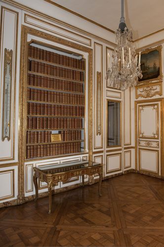 Nous poursuivons notre visite avec l 'une des trois bibliothèques dont Louis XVI disposait au Château de Versailles : cette grande pièce fut autrefois la chambre de Madame Adélaïde, avant de devenir le salon de compagnie où Louis XV recevait ses amis. Plus tard, Louis XVI transforma le lieu en une bibliothèque spécialisée dans la géographie, lieu projeté par l'architecte Gabriel. Le roi y recevra des scientifiques comme Montgolfier ou La Pérouse, et étalera cartes, boussoles et compas sur une grande table à cartes dont le plateau fut taillé d'une seule pièce dans une tranche de tronc de cèdre de Saint Domingue qui mesurait plus de deux mètres de diamètre. Afin de ne pas perturber les boussoles, cette table disposait de grosses vis ajustables servant à stabiliser le meuble en fonction de la dilatation du parquet selon les saisons. Plus loin, les deux globes céleste et terrestre portés par Atlas ont regagné leur place d'origine. On observe également une commode exécutée par Riesener et dont la marqueterie a étonnamment conservé ses tons verts au fil des siècles. Juste à côté, se trouvent plusieurs volumes des récits de voyage de James Cook annotés par le roi Louis XVI. Ce dernier aimait non seulement lire mais aussi tracer des cartes géographiques qu'il peignait ensuite à l'aquarelle. L'harmonie du décor de cette pièce est constante, et les murs sont ornés de dos de reliures peintes (portes comprises) avec, aux fenêtres, des rideaux garnis de motifs de chinoiseries choisis par Louis XVI.