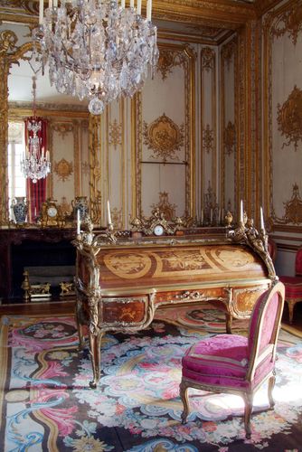 La pièce suivante est un cabinet d'angle, qui faisait office de bureau officiel du roi. Celui-ci y recevait ministres et ambassadeurs pour des séances de travail. Louis XV y disposait d'un imposant secrétaire à cylindre placé devant la cheminée: œuvre de l'ébéniste Oeben, achevée par Riesener, cette pièce richement ornementée fut fabriquée dans les années 1760 et demeure l'une des plus célèbres réalisations de l'histoire du mobilier français. On conçut d'abord un modèle réduit en cire à l'échelle d'1/9è extrêmement détaillé, avec reproduction à la peinture de la marqueterie et des bronzes. Il faudra neuf ans de travail afin de terminer cet imposant bureau de 600 kg (réalisé en fonte d'acier habillée de marqueterie), qui nécessita l'intervention de quatorze corps de métiers différents. Une simple rotation d'un quart de tour de clé déverrouillait l'abattant et l'ensemble des tiroirs. Et les domestiques du roi rechargeaient en encre et en papier le secrétaire en utilisant deux petites trappes dissimulées de chaque côté du meuble, même lorsque l'abattant de celui-ci était fermé. Cet abattant permettait d'accéder à six petits tiroirs tandis que le centre de la table, mobile, pouvait se relever pour être disposé comme un pupitre ou basculer vers l'avant, ouvrant ainsi l'accès à trois tiroirs supplémentaires, au fond du secrétaire. Le bureau est surmonté d'un plateau marqueté, entouré d'une petite balustrade en amarante avec, au centre, une horloge à double face, œuvre de Lépine. Ce meuble ne sera pas vendu par les révolutionnaires mais transporté dans des bureaux, aux Tuileries. Le bureau du roi permet aussi d'admirer un médaillé (sorte de commode), mais aussi l'assortiment des couleurs partout dans la pièce : le marbre surmontant les meubles correspondait à celui de la cheminée tandis qu'on peignait les plinthes de la pièce en faux marbre afin d'imiter le marbre griotte d'Italie. De même, la hauteur des meubles d'appui était, elle aussi identique partout dans la pièce, tout comme la hauteur des dossiers des chaises offrant à l'endroit à la fois raffinement et harmonie. Autre objet intéressant dans ce bureau : un candélabre, commandé par Louis XVI pour célébrer l'indépendance américaine.