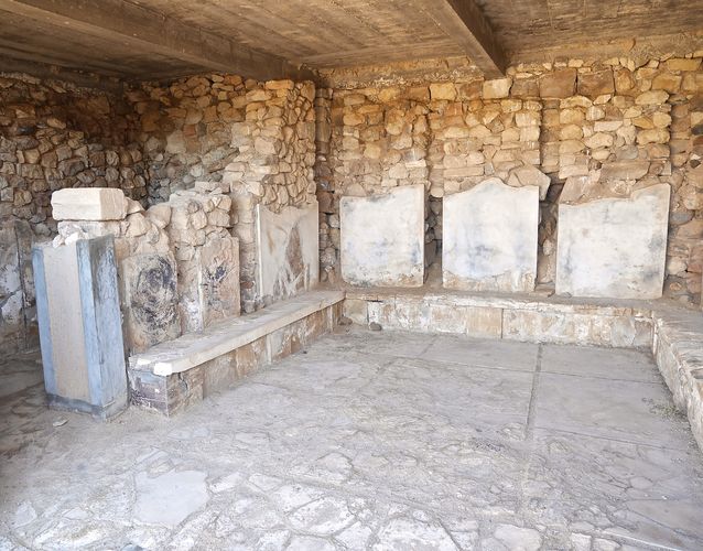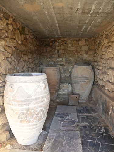 Justement, ces magasins (ci-dessous) rassemblaient les pitoï, de grandes jarres destinées à stocker des denrées alimentaires, et occupait une bonne partie de l'aile ouest du palais. Ces locaux abritaient aussi des artisans. Dans le magasin qui recevait les pitoï géantes, les archéologues retrouvèrent des jarres ornées de motifs en forme de disques et de cordes. L'aile ouest offrait aussi plusieurs sanctuaires, avec ses bassins de purification. Il existait deux types de sanctuaires : certains possédaient des bancs disposés le long des murs de petites pièces rectangulaires, d'autres se présentaient sous la forme d'une pièce avec piliers centraux, et recevaient le nom de sanctuaires circulaires.