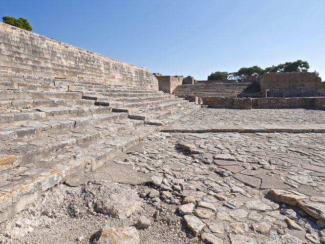 Je débute ma visite par la cour haute, la première des trois cours installées dans l'aile ouest du palais. La cour est traversée, du nord au sud, par un chemin processionnel utilisé jadis pour les processions sacrées et autres rituels. Compte tenu de sa hauteur, cette place jouait en quelque sorte le rôle d'observatoire, pour regarder ce qui se passait dans la zone ouest. En-dessous de cette cour, se trouvent la cour ouest et le théâtre (ci-dessous), espace pavé situé face à l'entrée principale du palais minoen, c'est à dire des escaliers et du Propylée qui se dressait autrefois. Cet espace, qui fut bâti à l'époque du premier palais, jouait un rôle important pour les occupants du palais. Cette cour comportait huit marches qui servaient de bancs aux spectateurs de ce qu’on appelait le théâtre. On s'y asseyait pour assister à des manifestations religieuses et à des fêtes. Cette cour ouest est également traversée par le chemin processionnel. Au temps du second palais, cette cour ouest avait été agrandie : elle était plus large et plus haute.