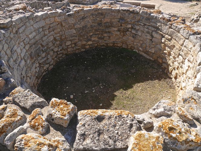 Autres curiosité du site : les puits circulaires (ci-dessous) : à l'extrémité sud de l'aile ouest, je remarque en effet quatre grands puits en pierre. On retrouve les mêmes structures au palais de Knossos et dans celui de Malia, structures dont on ignore toujours aujourd'hui l'usage. On pense qu'il pourrait s'agir d'entrepôts pour le grain ou encore de lieux d'offrandes aux sanctuaires du palais. Non loin de là, la façade ouest est construite à l'aide d'énormes blocs de pierre et répond aux règles de l'architecture minoenne pratiquée jadis. Nous l'avons vu précédemment, un Propylée s'élevait au sommet d'escaliers dans l'aide ouest, et symbolisait l'entrée principale du palais. Ce portique était formé d'une colonne centrale et de pilastres. Se dressait aussi un mur avec double ouverture et une colonnade formée de trois colonnes. Le sol était somptueusement pavé tandis que la colonnade donnait sur un puits à l'air libre qui collectait l'eau de pluie. Le Propylée offrait deux accès permettant de se rendre dans différentes parties du palais : le premier autorisait l'accès au péristyle, puis aux appartements royaux, et le second, conduisait à une antichambre débouchant sur les magasins puis la cour centrale.