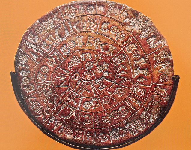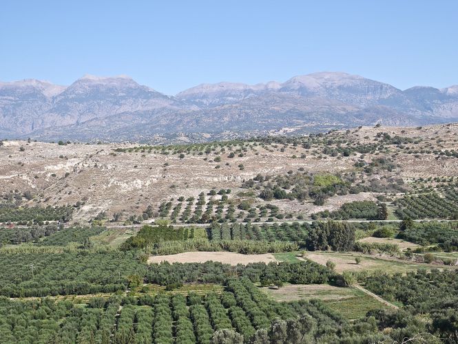 J'ai fait le tour des lieux en moins d'une heure, malgré l'existence de panneaux d'information détaillée. Au loin, s'étend la plaine de la Messara (ci-dessous) avec les montagnes au fond. Le palais de Phaistos disposait aussi, dans sa partie est, d'un ensemble de petites pièces réservées aux artisans. Des fours étaient aussi rassemblés dans cette zone. Dernière découverte lors des fouilles : un disque d'argile cuite découvert en 1908 par l'archéologue italien Luigi Pernier. Ce disque pourrait dater du milieu ou de la fin de l'âge du bronze minoen. Son diamètre est d'environ seize centimètres et il est couvert, sur ses deux faces, de hiéroglyphes imprimés à l'aide de poinçons. Ce sont en tout 241 signes, dont 45 différents, qui recouvrent le disque en formant une spirale partant de l'extérieur vers le centre de l'objet. On ne connait toujours pas son usage, sa signification ou même son lieu de fabrication.