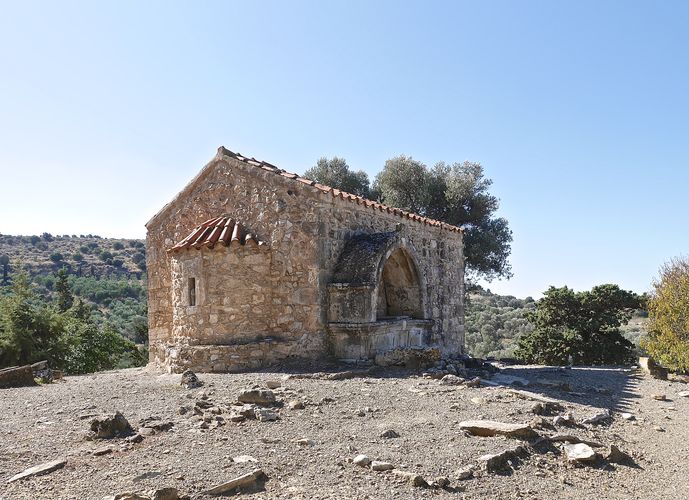 Je me rends ensuite à l'ancienne villa royale d'Agia Triada, située à trois kilomètres du palais de Phaistos. Pour ce faire, j'emprunte la même route en laissant une petite église sur ma gauche (celle-ci n'est située qu'à une centaine de mètres de l'entrée du site de Phaistos) puis emprunte la route pour Agia Triada située à droite (un panneau indicateur marque l'endroit). Quelques kilomètres plus loin, j'aperçois un panneau annonçant le site archéologique en question (au début d'une piste caillouteuse) mais pas d'entrée spécifique. C'est pourtant là qu'il faut stationner avant d'emprunter un escalier discret qui vous conduira au site, situé en contrebas. Sur place, pas de panneaux décrivant les ruines observées. C'est dommage, car l'histoire de ce site est complémentaire de celle du palais de Phaistos de la période néopalatiale. Cette villa, qui aurait probablement abrité de hauts dignitaires, présente toutes les caractéristiques de l'architecture palatiale minoenne. Les fouilles réalisées permirent d'y découvrir plusieurs tablettes en écriture linéaire A, des rhytons, des vases et des coupes. On mit même à jour un sarcophage en excellent état, décoré de scènes religieuses et cultuelles. On peut ainsi découvrir sur place de riches appartements, une agora mycénienne et des conduits d’adduction d'eau, des sanctuaires, une voie pavée, les vestiges de tombes voûtées (ci-dessous) et l' église médiévale d'Agios Georgios (deuxième photo).
