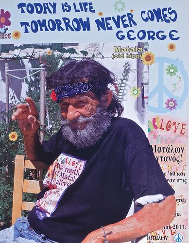 Je reviens sur mes pas, pour rejoindre l'endroit dont j'étais parti : à la même intersection, j'emprunte l'autre route, celle qui mène à Matala, désormais station balnéaire mais autrefois port de Phaistos, durant la période minoenne. On sait que l'endroit était déjà peuplé au néolithique car c'est à cette période que des grottes artificielles (ci-dessous) furent creusées dans la falaise de la baie de Matala. En 220 avant J.C, Matala fut occupée par les Gortyniens. Aux Ier et II è siècles après J.C, les grottes seront utilisées comme caveaux et le général Brutus aurait été enterré dans l'une d'entre elles. Je visite donc ce lieu reposant qu'est devenu ce cimetière romain. Il est bien précisé que je pénètre dans ce lieu à mes risques et périls. Devenu ensuite village de pêcheurs, Matala sera en quelque sorte le Saint Tropez crétois en accueillant, dans les années soixante, un grand nombre de hippies qui se réfugieront d'ailleurs dans les fameuses grottes. Repos garanti ! Aujourd'hui, la petite station subsiste essentiellement grâce au tourisme et convie les visiteurs à se joindre chaque année aux festivités du festival de musique rock des années 70 et de reggae qui a lieu près de la plage. L'esprit Peace and Love n'a décidément pas quitté les lieux...