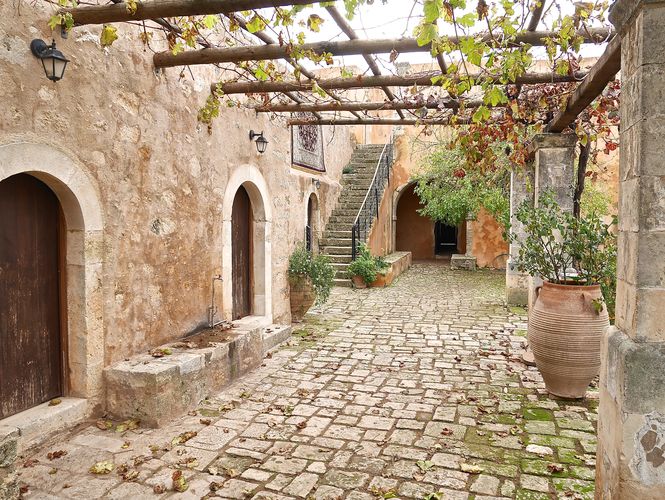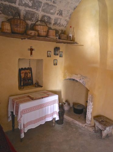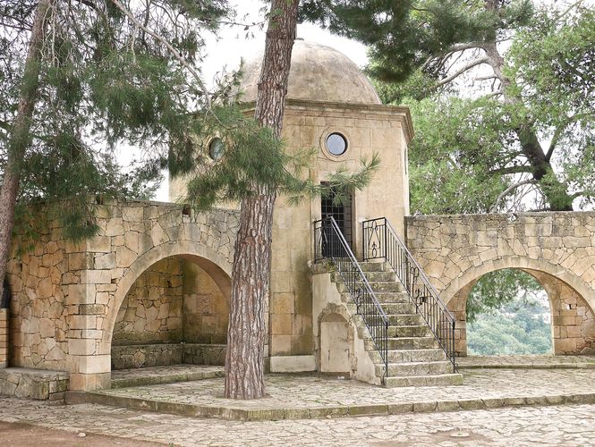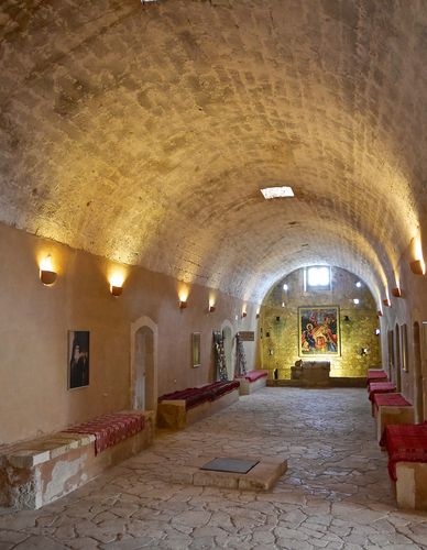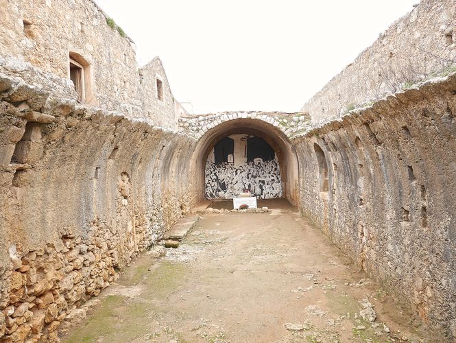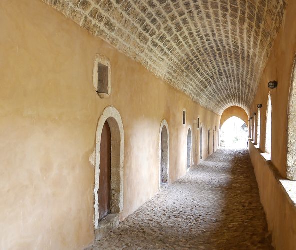 La salle à manger historique est aujourd'hui devenue un musée, où il est malheureusement interdit de prendre des photos. Ce fut le premier endroit où les moines prenaient leur repas. L'endroit est désormais devenu lieu de martyre depuis le massacre par les Turcs de 36 jeunes ici-même. Non loin de là, l'ancien dépôt d'huile accueille la boutique du monastère avec vente de souvenirs et d'icônes. Elle voisine avec le réfectoire. Des celliers sont toujours visibles et servaient jadis de refuge aux nombreux ouvriers, aux passants divers et aux pèlerins. A côté de la poudrière, se dresse encore la porte candiote, porte est, qui était autrefois utilisée comme accès immédiat pour les hommes et les animaux afin de se rendre dans les champs du monastère. Toutes proches, se trouvent les cellules monacales (ci-dessous), lieu de prière et de méditation pour les moines. Un portillon constituait l'entrée sud du monastère et était utilisé par les bergers. C'est de ce même portillon que trois messagers du monastère prendront la fuite pour aller chercher de l'aide, en novembre 1866, lors des attaques ottomanes. A proximité, s'étire un long couloir (deuxième photo) qui donnait sur d'autres cellules réservées aux moines (dont on peut voir certaines d'entre elles).