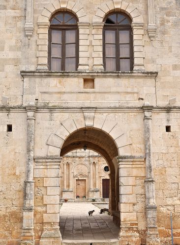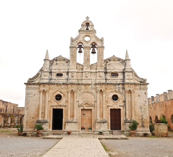Le monastère que je visite cette fois est situé sur un plateau fertile, à 23 kilomètres au sud de Réthymnon. Son allure de forteresse rehaussée d'une remarquable façade Renaissance étonne. Son origine remonte au XV ème siècle et ce centre religieux prit beaucoup d'importance entre les XVI è et XVIII è siècles. Ses 300 moines (il n'en reste plus que trois de nos jours) qui vivaient sur place bénéficiaient alors de revenus confortables. On y copiait à grande échelle des manuscrits (dont la plupart seront perdus lors de la destruction du bâtiment par les Ottomans en 1866). Arkadi fut aussi un des hauts lieux de résistance contre l'occupation ottomane, ce qui le rendit encore plus célèbre. On ne connait pas exactement la date de sa fondation mais on pense que ses fondations auraient été posées tantôt par l'empereur byzantin Héraclius, tantôt par l'empereur Arcadius (hypothèse plus probable) dès le V ème siècle (d'où le nom actuel du monastère Arkadi). Vers la fin du XVI ème siècle, la Crète vécut une période d'intense création culturelle et artistique et le monastère subit des transformations : l'endroit est transformé en monastère de cénobites et l'église à deux nefs, dont l'érection aura duré 25 ans, date de cette époque (une inscription à la base de son clocher mentionne 1587). Sa façade (ci-dessous) est marquée par l'influence de la Renaissance, l'île se trouvant sous domination vénitienne à cette époque-là. On le remarque dans son architecture, qui mélange à la fois des éléments romans et baroques. Parallèlement, des étables sont ajoutées en 1610, puis, un réfectoire en 1670.