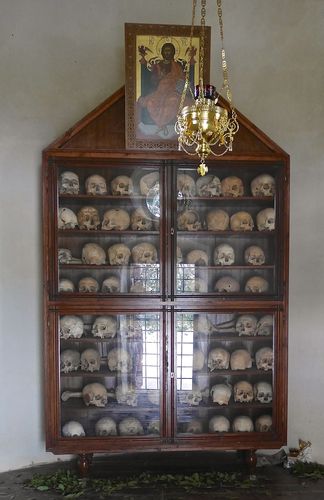 Autre lieu d'importance au monastère : la poudrière (en photo ci-dessous). Avant 1866, celle-ci était dans la partie sud de l'enceinte. Mais, un peu avant l'attaque turque, et par crainte que ceux-ci puissent facilement percer les parois de la pièce et ne fassent exploser la monastère, les munitions furent déplacées dans le cellier, qui se situe à environ 75 centimètres en contrebas par rapport à l'entrepôt initial, pour plus de sécurité. Le bâtiment, de forme oblongue et voûtée, a une longueur de 21 mètres et une largeur de 5,40 mètres. C'est cette salle qui explosa en 1866, et une plaque commémorative (deuxième photo) y est placée depuis 1930, en souvenir des tragiques évènements.