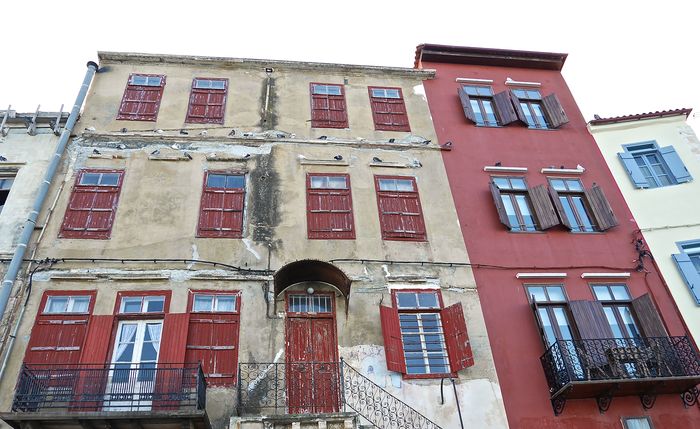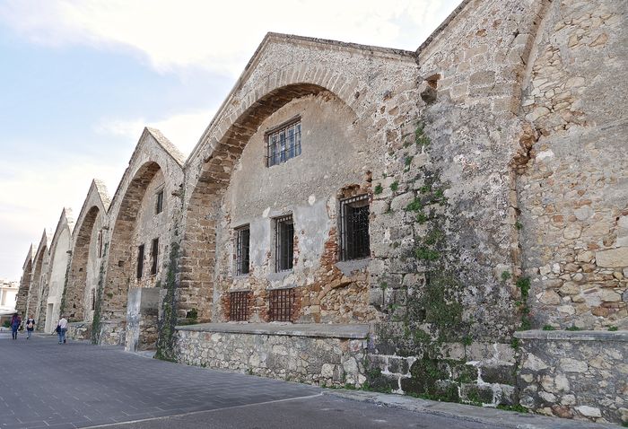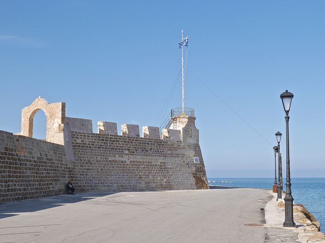 En poursuivant ma promenade, je découvre bientôt le fort Fiskas (ci-dessous) qui fut jadis une caserne turque utilisée comme prison sous l'occupation ottomane. Au-dessus du porche, trône toujours le lion vénitien de saint Marc. Des remparts qui bordent la cour, on peut profiter d'une jolie vue sur le port de Chania. C'est à cet endroit que fut hissé pour la première fois le drapeau grec, le 1er décembre 1913, afin de commémorer le rattachement de la Crète à la Grèce. Il faut enfin savoir qu'une chaine tendue entre phare et ce fort, bloquait l'accès à des navires ennemis en cas d'intrusion. Il fallait y penser. Je suis stupéfait par la transparence de l'eau du port, qui laisse apparaître des oursins accrochés aux rochers peu profonds, tandis que des pigeons entament une conversation le long d'un quai. Dans le partie orientale du port se dressent encore de nos jours le grand arsenal (deuxième photo) : sa construction débuta en 1585, sous les ordres de l'intendant Alvice Grimani, avec des murs très épais et à distance des autres arsenaux, ce qui fait sans doute qu'on l'ait surnommé le Grand Arsenal, histoire de le différencier des autres. Un deuxième étage sera bâti en 1872, pendant l'occupation ottomane, et le bâtiment d'avoir été depuis utilisé tour à tour comme bureaux administratifs, comme école chrétienne et même comme théâtre à partir de 1892. On l'utilisera comme hôpital en 1923 et comme mairie entre 1828 et 1941. De nos jours, diverses manifestations s'y tiennent, tout comme un centre d'architecture méditerranéenne. Le reste des docks (Neoria, sur la troisième photo ci-dessous) fut bâti par les Vénitiens en 1204, dans le même port, et servait à abriter les navires. Ils étaient constitués à l'origine de dix-sept édifices accolés (troisième photo ci-dessous), très longs, voûtés et ouverts aux extrémités, servant à l'époque à abriter les galères vénitiennes. On n'en compte plus aujourd'hui que sept, tous fermés au public. Cinq autres s'élevaient pourtant un peu plus loin sur la digue. Il n'en reste désormais que deux (dont un abrite un café branché, et l'autre, une exposition permanente d'architecture traditionnelle et ancienne, qui offre d'admirer la reproduction grandeur nature d'un navire minoen datant du XV ème siècle avant J.C, et réalisé selon les techniques en vigueur à l'époque).