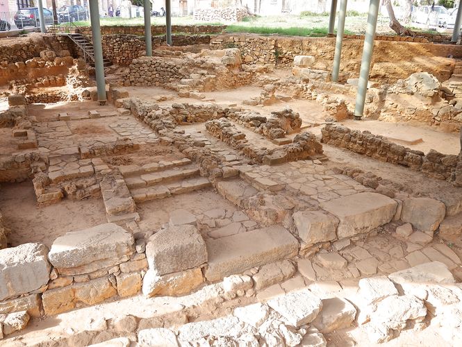 Un peu plus haut que le port, et à proximité du grand arsenal, des fouilles (ci-dessous) confirmèrent que le site de Chania avait bien été occupé dès l'époque prépalatiale (3000-2000 avant J.C) et sans discontinuité jusqu'à nos jours. Les ruines minoennes visibles le long de la rue Kanevaro, ont été mises à jour depuis 1965, et permettent d'observer les fondations d'une grande maison du XIV ème siècle avant J.C, dans laquelle furent découverts plus de 300 vases intacts, des inscriptions, et des bijoux exposés depuis, au musée archéologique de la ville.