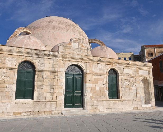 On dispose de peu d'informations sur l'histoire de la ville au début de la période de domination byzantine. Les armées musulmanes prendront possession de l'île crétoise en 824, mais celle-ci sera reconquise par les Byzantins en 921, date à laquelle Chania commence à ériger des fortifications pour se protéger d'autres éventuelles attaques musulmanes. En 1204, après la quatrième croisade et le démantèlement de l'Empire byzantin, la Crète est offerte à Boniface, marquis de Montferrat, lequel choisira de la revendre aux Vénitiens. En 1252, ces derniers parviendront à s'imposer aux Crétois mais onze ans plus tard, les Génois débarqueront dans la cité avec l'appui de la population locale et sous l'autorité du comte de Malte, Henrico Pescatore, et la conserveront jusqu'en 1285, date de la reconquête vénitienne. C'est à ce moment-là que la ville prendra le nom de La Canea (nom d'origine italienne) et prendra aussi la forme qu'on lui connait de nos jours. Malgré les fortifications, il ne faudra aux Turcs que deux mois de siège pour la conquérir. Après avoir débarqué au monastère de Gonia, à Kissamos, ils avaient pillé et incendié l'endroit avant de s'emparer ensuite de La Canée, le 2 août 1645, au terme d'un siège sanglant qui entrainera la mort de 40000 Turcs. Les églises seront ensuite peu à peu transformées en mosquées et les richesses de la ville, confisquées. Sur le port vénitien, je remarque la présence de la mosquée des Janissaires (ci-dessous), l'un des principaux vestiges de la présence turque et musulmane. Avec ses dômes aux tons rosés qui la chapeautent, la première mosquée de la ville, qui fut édifiée par les Ottomans dès l'année de leur arrivée, est un véritable manifeste visible depuis tout le quai, même si son minaret a été détruit peu après le rattachement de la Crète à la Grèce, en 1920. L'édifice n'est désormais plus un lieu de culte depuis la fin de la guerre avec la Turquie et l'expulsion des Crétois musulmans vers l'Anatolie en 1923. Le bâtiment sert de temps à autre de lieu d'exposition.