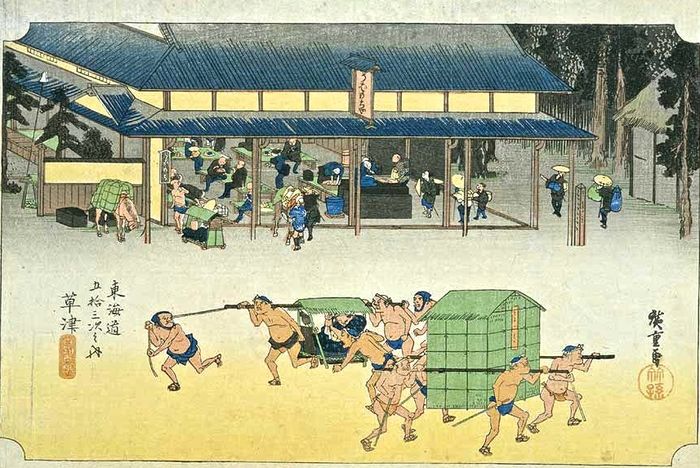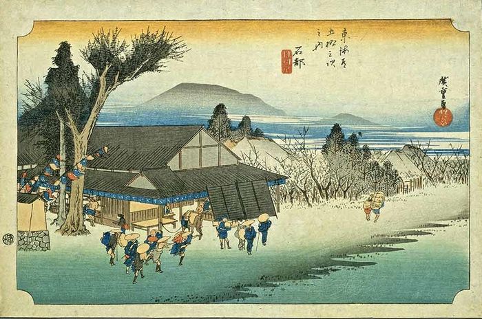 J'ai définitivement quitté Kameyama par le train omnibus de 8h00 pour me rendre à ma prochaine escale, Kyoto. Je ne raffole pas de cette ville tant il y a de visages pâles qui transforment l'ancienne capitale impériale en piège à touristes. D'ailleurs, je le ressentirai nettement, compte tenu de la différence de comportement des Japonais sur place (amabilité,serviabilité...). De plus, la circulation y est infernale et on attend une éternité aux passages pour piétons. C'est Kusatsu que je vous emmène cette fois, non sans avoir laissé Ishibe derrière moi, sans même m'y arrêter. L'ancienne station du Tokaido, la 51 ème du nom, est reliée au chemin de fer, mais le coin est perdu dans la campagne et le temps me manquait. Ishibe (sur l'estampe ci-dessous) est désormais rattachée à la ville de Konan (où se trouve, soit dit en passant, un village de Ninjas, à découvrir si vous passez par là). Autrefois, on disait qu'il fallait une journée environ pour se rendre de Kyoto à cette station : « Lever à Kyoto et coucher à Ishibe » voulait bien dire quelque chose.