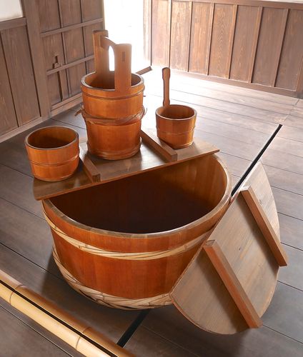 La seconde plus belle pièce de l'auberge était la Mukai-Jyodan (ci-dessous), qui ne se trouvait pas si loin des toilettes (Jyodan-Settin) exclusivement réservées au daïmio. A l'autre bout du bâtiment principal se trouvait la cuisine (deuxième photo), appelée aussi Daidokoro-doma. C'est là qu'étaient préparés tous les repas. Pour la toilette, il fallait passer du bâtiment principal à un autre petit local surnommé Yudono (salle de bains, ci-dessous sur la deuxième photo), à l'usage exclusif du daïmio. Cette même pièce servait à la fois au maitre pour se déshabiller et se rhabiller et pour se laver. Depuis la petite passerelle, les hôtes pouvaient admirer un jardin japonais typique.