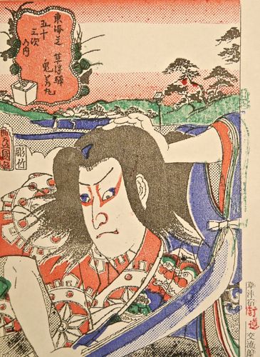 C'est au musée relatant l'histoire de l'ancienne station de Kusatsu (en estampe ci-dessous) que je réaliserai ma propre  ukiyo-e (deuxième photo ci-dessous), un exercice enfantin, à condition de bien s'y prendre. Il me sera interdit de prendre des photos et toutes les explications sont, là encore, rédigées, en langue japonaise. J'apprendrai cependant que ce musée ouvrit ses portes en 1999, afin de présenter au public un certain nombre d'objets utilisés par les pèlerins notamment, des livres et des documents d'époque. On peut aussi y voir une grande maquette de la ville. On distille ici (à condition de lire la japonais couramment et dans le texte), l'histoire des routes shogunales (kaido) depuis le début du XVII ème siècle jusqu'à la fin du XIX ème. Je vous l'ai dit, on y aborde aussi l'ukiyo-e, ou image du monde flottant, mouvement artistique japonais de l'époque Edo comprenant les estampes japonaises gravées sur bois. On y apprend qu'une telle image était conçue par trois personnes : celle qui dessinait la scène, celle gravait le dessin dans le bois, et la troisième qui l'imprimait à l'encre. Le musée permet aussi de se pencher sur le mode de vie des voyageurs et des pèlerins, et sur leurs lieux de repos, comme les honjin par exemple. Et, bien sûr, les repas qui y étaient servis. J'y apprendrai que la ville-étape de Kusatsu, outre deux honjin, possédait aussi deux waki-honjin (auberges secondaires)  et 72 ryokan (autres établissements hôteliers). On y parle de la rivière de Kusatsu, une rivière aérienne, puisque son lit est situé au-dessus du niveau du sol, d'où son nom « rivière de plafond ». Non, non, je vous assure, je n'ai pas insisté sur le saké ! Le cours d'eau n'était d'ordinaire pas profond et il était courant pour les habitants de le franchir  à pied. Lorsque le niveau de l'eau était plus élevé, on franchissait la rivière à dos d'homme, et il en coûtait alors 120 yens pour la traversée (pour une hauteur d'eau de trente centimètres environ).