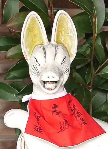Le long du Nakasendo, je m'arrête au sanctuaire Oshoii (ci-dessous) qui vénère la déesse Tagorihime, fruit d'une promesse entre amaretsu et Susanoo. Au fond, se dresse un plus petit sanctuaire dédié à Inari, divinité shinto japonaise des céréales, puis des fonderies et du commerce, mais aussi gardien des maisons. Sans doute cela explique t-il la présence d'un renard (deuxième photo) dans chacun des sanctuaires qui lui sont consacrés.