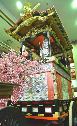 Je poursuis ma promenade pluvieuse à Otsu, ville qui fut brièvement, elle aussi, capitale du Japon, il y a 1300 ans. Le long d'une galerie commerçante, se trouve le musée de la fête d'Otsu, avec la copie authentique d'un des treize chars (hikiyama) qui participent à ce rendez-vous annuel d'octobre, quelques jours avant la fête nationale de l'éducation physique. Une parade de chars a alors lieu en commémoration du sanctuaire Tenson (ci-dessous) et un tirage au sort a lieu pour déterminer l'ordre d'apparition des chars, tandis que le char Saigyozakuratanuki-yama, lui, ouvre tous les ans le défilé. Ce char, construit en 1635, a pour légende un raton-laveur, et porte plus communément le nom de Tanuki-yama, plus facile à prononcer. Le char que je découvre au musée (deuxième photo) est appelé Seiobo-zan, ou Momoyama. Il date de 1656 et tient son nom d'une femme ermite portant le nom de Seiobo, qui vivait au Mont Kunlun-Shan (Chine) et redescendit sur terre sous la forme d'une nymphe céleste qui offrit à l'empereur une pêche pour célébrer sa longévité. Cette pêche était si précieuse que le pêcher dont elle provenait ne donnait un fruit qu'une fois tous les 3000 ans. D'où la présence sur ce char d'une pêche s'ouvrant en deux pour laisser apparaître une marionnette représentant l'empereur.