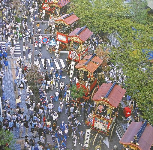 Les chars sont tout d'abord rassemblés (troisième photo ci-dessous) avant la parade. Puis rejoignent leur hangar respectif à l'issue de la fête jusqu'à l'année suivante. Chaque char possède une unique marionnette qui s'exprime devant le public lors du défilé. On dit que les heureux spectateurs qui réussissent à attraper l'un des chimaki (bouquet de bambou et de paille de riz) lancés depuis les chars, connaitront le bonheur pour l'année à venir. Compte tenu de sa situation stratégique le long du lac Biwa permit à Otsu de devenir un lieu d'échanges commerciaux important dès le XVI ème siècle, avec des liens de communication avec Kyoto, autant de sources d'enrichissements pour ces marchands qui patronnèrent les chars de la ville, durant la période Edo et au XVII ème siècle. A l'origine de cette tradition d'Otsu, l'histoire d'un marchand de sel, Shiouri Jihei, qui, en 1596, inventa une danse effectuée avec un masque de raton-laveur lors de la fête du sanctuaire Tenson. Le public apprécia beaucoup la danse et construisit deux ans plus tard un char en bambou sur lequel Shiouri Jihei exécutera sa danse pour le grand plaisir des spectateurs. Et cette tradition de se poursuivre les dix années suivantes. Mais un jour, l'état de santé du vendeur de sel ne lui permit plus de danser et le char fut alors équipé d'une marionnette Tanuki.
