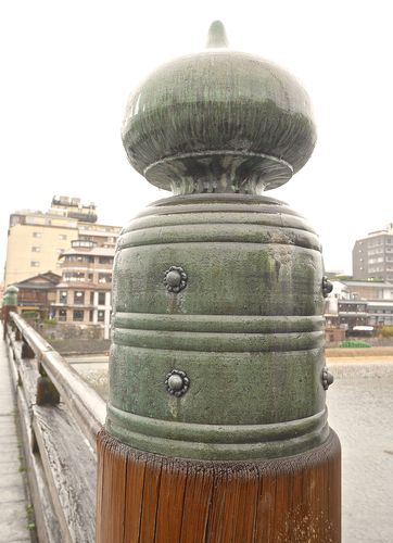De retour à Kyoto, je saute dans un bus au départ de la gare JR et pars à la découverte de l'étape d'arrivée de la route shogunale du Tokaido : Sanjo Ohasi (en estampe ci-dessous) est un pont de Kyoto qui enjambe la rivière Kamo, resté célèbre pour avoir à la fois servi de terminus pour le Nakasendo et le Tokaido. La date de construction de ce pont (deuxième photo) n'est pas connue mais des documents attestent que Toyotomi Hideyoshi donnera l'ordre d' y effectuer des réparations en 1590. La construction est entre autre reconnaissable à ses giboshi originels (poteaux en forme d'oignons sur la troisième photo ci-dessous). Ce pont, qui mesure aujourd'hui 74 mètres de long et quinze mètres de large, fut très tôt un lieu stratégique pour le passage des hommes et des marchandises, même si on pense qu'il ne s'agissait au départ que d'une simple structure qui survivra jusqu'à la période Muromachi. Il faudra attendre 1590 pour que l'ouvrage prenne sa forme définitive grâce à l'intervention du magistrat Masuda Nagamori. Du pont d'hier reste encore, à l'extrémité nord-ouest de l'ouvrage, un piler en pierre qui marque l'endroit où l'on affichait jadis les dépêches publiques.