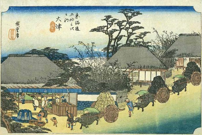 53 ème station de la route du Tokaido, Otsu-juku (ci-dessous) était aussi la 69ème et dernière station du Nakasendo. Elle abritait deux honjin, une waki-honjin (auberge secondaire) et 71 auberges pour les autres voyageurs. A ma descente du train, je me rends à l'office du tourisme qui se trouve juste devant la gare. Là se tient un mobile-home où une dame japonaise, qui pratique la langue française, vous accueille pour vous vanter les attraits de la région. Il apparaît que la route du Tokaido traverse le centre-ville d'Otsu où quelques anciennes maisons demeurent encore bien qu'elles ne soient pas aussi remarquables qu'à Seki (deuxième photo).
