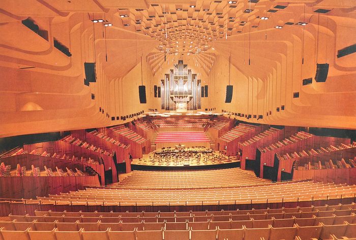 D'une longueur de 183 mètres et d'une largeur maximale de 120 mètres, l'édifice s'étend sur près de deux hectares. Il est supporté par 580 piliers de béton qui s'enfoncent jusqu'à 25 mètres au-dessous du niveau de la mer. Côté énergie, ses besoins équivalent à une ville de 25 000 habitants et le courant est distribué par 645 kilomètres de câbles. L'Opéra de Sydney est innovant par définition : l'ensemble est organisé par l'empilement de deux ou trois coquillages qui se recouvrent partiellement les uns les autres, et les coquilles sont entourées par des terrasses faisant office de promenades piétonnes. Les voûtes supportant la construction sont de conception inédite tandis que le toit est constitué de 1 056 006 tuiles de céramique blanche, autonettoyantes, conçues à partir d'une même figure géométrique et fabriquées en Suède. La décoration intérieure (ci-dessous) est quant à elle assurée par du granit rose extrait des carrières de Tarana (Nouvelle Galles du Sud). C'est au suédois Jorn Utzon, architecte de son état, qu'on doit l'Opéra de Sydney. Aujourd'hui disparu, notre homme avait avoué un jour avoir créé une sculpture, une chose vivante qu'on ne se lasse pas de regarder. L'oeuvre est effectivement une totale réussite. A l'origine, c'est Eugène Goossens, alors directeur du conservatoire de musique de l'Etat de Nouvelle Galles du Sud qui, à la fin des années 1940, réclama un lieu adéquat pour recevoir ou concevoir des productions théâtrales ou musicales. Il faudra attendre 1955 pour que soit retenu le projet de l'architecte Jorn Utzon (parmi 233 autres projets). Trois ans plus tard, la construction de l'opéra démarrait. Elle allait durer quinze années. Et couter 102 millions de dollars australiens (loin des sept millions initialement prévus en 1957). Sa Majesté la Reine Elizabeth II inaugurera l'édifice le 20 octobre 1973, avec feux d'artifice et exécution de la neuvième symphonie de Beethoven à la clef. Cet événement sera suivi par des millions de téléspectateurs.
