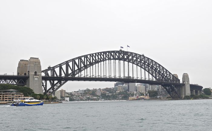 Pont en arc métallique, le Harbour Bridge (ci-dessous) est tout un symbole. Les premiers projets remontent à 1815, lorsque Francis Greenway proposa de bâtir un pont pour traverser le port, en vain. Ce ne fut qu'en 1890 que les autorités commencèrent à se pencher sur l'idée de notre architecte, pour voter la construction du pont actuel en...novembre 1922. Détail d'importance : tous les ouvriers qui participèrent au chantier furent australiens, même si c'est l'ingénieur français Georges Imbault qui présentera le projet final (sous l'égide d'un ingénieur anglais, histoire de faire bonne mesure), projet dont le début de construction, en 1923, coïncidera avec le chantier de la ligne de train City Circle. Pas moins de 800 maisons devront être détruites afin de permettre le passage de l'ouvrage. Les fondations furent coulées en 1925, puis les points d'ancrage érigés, puis achevés en 1928. Vint alors l'assemblage du gigantesque mécano métallique que constituait le pont lui-même : des grues flottantes stabilisaient alors les pièces montées les unes à la suite des autres et les deux demi-arches, elles, furent maintenues en équilibre par un savant système de câbles jusqu'à ce que le pont métallique soit enfin terminé d'une rive à l'autre et que les deux parties du pont se rejoignent. Route et voies ferrées seront achevées en 1931 et le pont d'être inauguré un an plus tard.