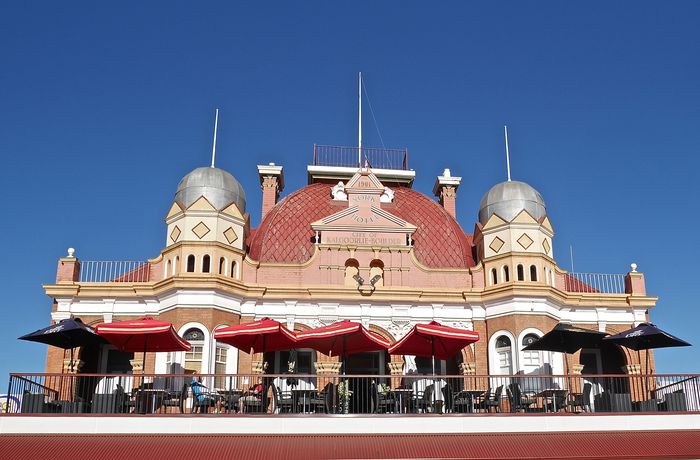 Avant de quitter le musée, j'emprunterai l'ascenseur qui me conduira sur la plateforme supérieure de la tour qui surmonte le musée en question. De là, je profiterai d'une vue panoramique sur Kalgoorlie-Boulder. De retour sur la terre ferme, je me promènerai dans la rue Hannan en repérant les façades d'immeubles dignes d'intérêt. Dix d'entre elles ont fait l'objet de photographies que vous retrouverez dans l'album de cette sortie (en cliquant sur l’icône en haut à droite de cet article). Le York Hotel (ci-dessous) en fait partie. Ce bâtiment emblématique de la ville est superbement conservé et respire la grâce et l'excellence. Construit en 1896 pendant la ruée vers l'or, son architecture victorienne présente une façade chamarrée coiffée d'une coupole.