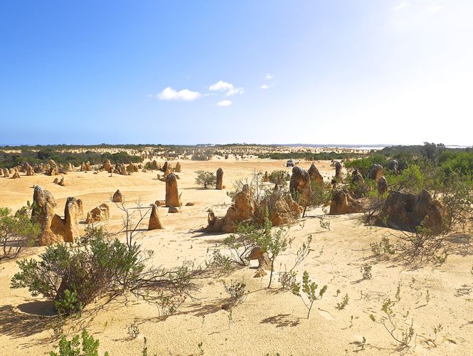 Il est en effet possible (et les gens ne s'en privent pas) de visiter ce désert en voiture car une route à sens unique est tracée à l’intérieur de l'étendue sableuse, avec, ici et là, des aires de stationnement. Disposant d'un véhicule lourd, je préfère faire la balade à pied, d'autant plus que le temps est ensoleillé et le fond de l'air légèrement frais. Il faut par contre veiller à ne pas se perdre dans cet enchevêtrement de pierres verticales, car le désert ne dispose d'aucun panneau fléché pour trouver la sortie (le seul moyen de retrouver la sortie restant de suivre la route en boucle). Pour un peu, je me croirais à Carnac. Certaines pierres mesurent jusqu'à 3,5 mètres de hauteur mais il est dans tous les cas déconseillé de grimper sur les pinacles car les pierres faites de calcaire sont friables et cassent parfois, pouvant blesser au passage. Il paraît que le printemps (d’août à octobre) est la meilleure époque pour visiter le lieu car des millions de petites fleurs recouvrent le sol et contribuent encore un peu plus à la magie de ce désert. Je serai obligé de revenir...