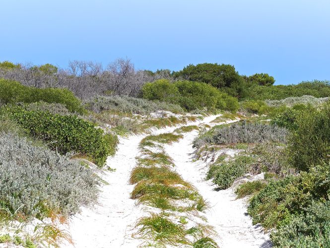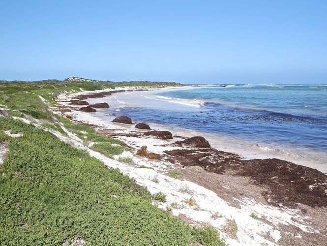 Mis à part ce désert des Pinacles, le parc offre d'admirer, à deux pas d'ici, la superbe baie Hangover (ci-dessous). Avec sa grande étendue de sable fin, la baie est tout à fait indiquée pour pratiquer la plongée au tuba, la natation ou la planche à voile. Dauphins, lions de mer, et même des baleines (si vous vous trouvez là à la bonne saison et au bon moment!) peuvent être aperçus de temps à autre. Cette zone maritime de l'océan indien correspond au parc marin de Jurien Bay. La végétation rencontrée en bord de route est quant à elle constituée de banjine côtière et de bien d'autres plantes communes vivant habituellement sur le littoral. De la route, j'apercevrai quelques grandes dunes de sable blanc au milieu de la végétation. Vous pourrez à cet endroit parfois tomber sur des reptiles comme le python de tapis mais on m'a assuré que ce serpent était parfaitement inoffensif (encore faut-il tomber sur le bon serpent avec la bonne tête, car, si tous ne mordent pas, un Australien m'avouait récemment que les serpents avec un tête étroite et effilée sont venimeux et qu'en cas de rencontre, mieux vaut rester immobile jusqu'à ce que l'animal parte). Les serpents non venimeux ne sont pas légion en Australie, et mieux vaut, à titre de précaution, retenir un seul numéro de téléphone à alerter en cas de morsure (à condition de porter son portable chargé toujours sur soi): le 000. Le parc marin de Jurien Bay offre de son côté de nombreux récifs immergés très pittoresques, avec également de vastes lagunes peu profondes abritant une grande variété d'animaux et d'espèces végétales. En règle générale, le parc de Nambung abrite 176 espèces animales, dont 128 espèces d'oiseaux, 8 espèces de mammifères (dont le kangourou gris de l'ouest, le kangourou rouge, le dingo, le mini possum et le renard rouge) et 15 espèces de reptiles, sans oublier de nombreux poissons et un seul amphibien.