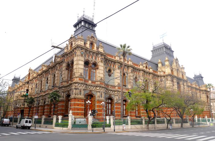 Le style architectural du palais constitue quant à lui un exemple exceptionnel, voire unique en Argentine d'architecture éclectique de la fin du XIX ème siècle, avec ses jardins circonscrits par des grilles de fer entre les piliers. Rappelons qu'en matière d'architecture, l'éclectisme est une tendance consistant à mêler des éléments appartenant à différents styles ou époques de l'histoire de l'art ou de l'architecture, tendance qui se développera tout particulièrement en Occident de 1860 à la fin des années 1920. On y décèle la Renaissance française avec ses sveltes mansardes faites d'ardoises. Les quatres façades du bâtiment sont pour leur part recouvertes de céramique vitrifiée (300 000 céramiques venues d'Angleterre seront nécessaires) représentant les écussons des diverses provinces du pays (ci-dessous). L'armature métallique du bâtiment sera quant à elle importée de Belgique. Pour la base des murs, on utilisera les briques les plus résistantes, fabriquées à la briqueterie San Isidro, non loin de là, un mode de construction résistant qu'un tremblement de terre permettra de vérifier le 27 octobre 1894. On ne décèlera alors aucune fissure dans l'édifice. Ce sont donc 400 ouvriers qui s'attelleront ainsi à la réalisation de la construction qui durera sept années, avant que le Président argentin de l'époque, Luis Saenz Pena n'inaugure l'ensemble en 1894, qui offre un style bien particulier, et d'une beauté peu commune.