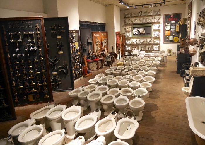 Le musée de l'eau et de l'histoire sanitaire où je vous emmène aujourd'hui propose aux visiteurs de découvrir et d'approfondir leurs connaissances sur l'histoire du système d'assainissement de la capitale argentine. Ce musée fut créé en 1958, sous le nom de musée techniques des sanitaires. Je suis pour ma part accueilli par Monsieur Tartarini en personne qui est le directeur de ce musée, mais également l'auteur de plusieurs ouvrages sur Buenos Aires, dont un sur le Palais des Eaux. Il me montrera les sanitaires accumulés au fil des ans qui constituent toujours à l'heure actuelle la base de la collection permanente. On découvre également sur place l'histoire des canalisations depuis les premiers travaux d'assainissement vers 1869 et jusqu'au XX ème siècle, dont l'essentiel fut importé d'Europe. Afin de contrôler les pièces étrangères mais aussi celles fabriquées en Argentine, on créa en septembre 1887 un bureau chargé de réaliser des tests d'épreuve sur les matériaux. Sur place, on peut encore observer des canalisations originaires d'Angleterre (dont certaines des maisons Kidston & Co ou Geo.Jennings à Londres) et des matériels divers en bois et en céramique. La consommation d'eau potable supposait de mesurer le débit utilisé par les habitants. Pour ce faire, des compteurs d'eau deuxième photo ci-dessous) furent dès le départ prévus à travers un règlement publié dès 1869. Les premiers compteurs à turbine, de marque Stoll, Thompson ou Siemens, seront ainsi mis en service chez l'habitant en 1889. En 1939, la capitale comptait 17260 compteurs d'eau, vérifiés par l'Office des appareils enregistreurs des œuvres sanitaire de la nation. Cette même administration contrôlait également la robinetterie et ses accessoires, utilisés dans les cuisines et les salles de bain. Et l'industrie nationale argentine de trouver un nouveau souffle à partie de la Seconde guerre mondiale avec le développement de marques comme Piazza Hermanos, La Rural, Franklin y FV (fondée en 1921). Des concours étaient alors organisés afin de susciter la créativité et l'ingéniosité nationale pour inventer ou améliorer la robinetterie. Le musée expose aussi des objets parfois inattendus comme ces toilettes de prison (comprenant lavabo et assise en un seul bloc), des toilettes à la turque, des urinoirs, des chasses d'eau et des bidets mobiles (troisième photo ci-dessous)...Les chasses d'eau, elles, offrent plusieurs modèles (en bois, en verre et en acier chromé). Cette visite offre enfin de consulter sur place un nombre important de documents relatifs à l'assainissement de Buenos Aires, dont les plus anciens remontent à 1872. On peut trouver dans ces archives les plans de conduites (type, ancienneté, diamètre, profondeur d'enfouissement et extensions), les matériaux de construction utilisés, les informations sur les installations réalisées chez les particuliers...autant de renseignements qui coulent de source !